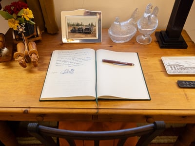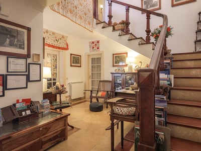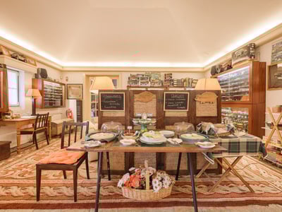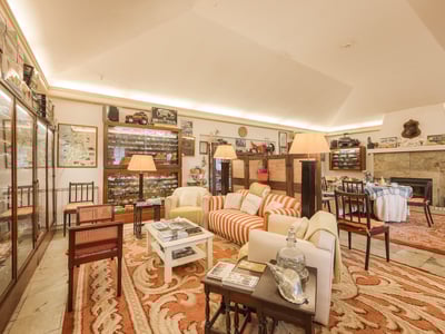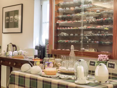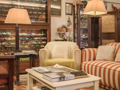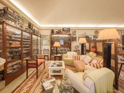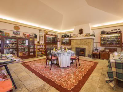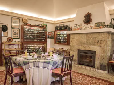 Na sala dos hóspedes uma muito peculiar decoração com uma colecção particular de miniaturas de modelos reduzidos da marca Land Rover e adereços diversos relacionados com esta mítica marca inglesa de veículos todo o terreno.