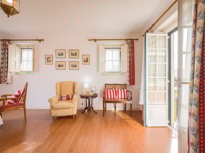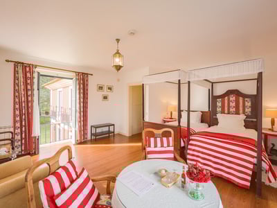 Quarto de grandes dimensões com uma área total de cerca de 30 m², com duas camas individuais, em que o pormenor dos seus dosséis, em conjugação com a restante mobília, autenticam o seu estilo bem clássico e diferenciador.