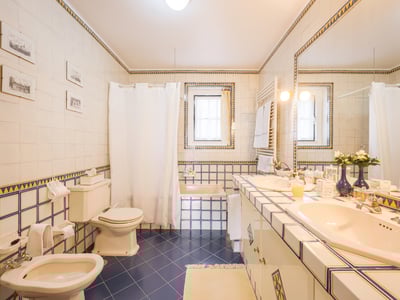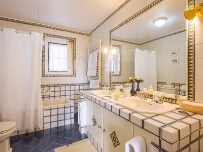 A ampla casa de banho, com as comodidades associadas, dispõe de 2 lavatórios e uma banheira com chuveiro adaptado. Neste quarto é possível acomodarem-se 2 adultos e até mais 1 criança ou 2 bebés em cama ou berços extra.
